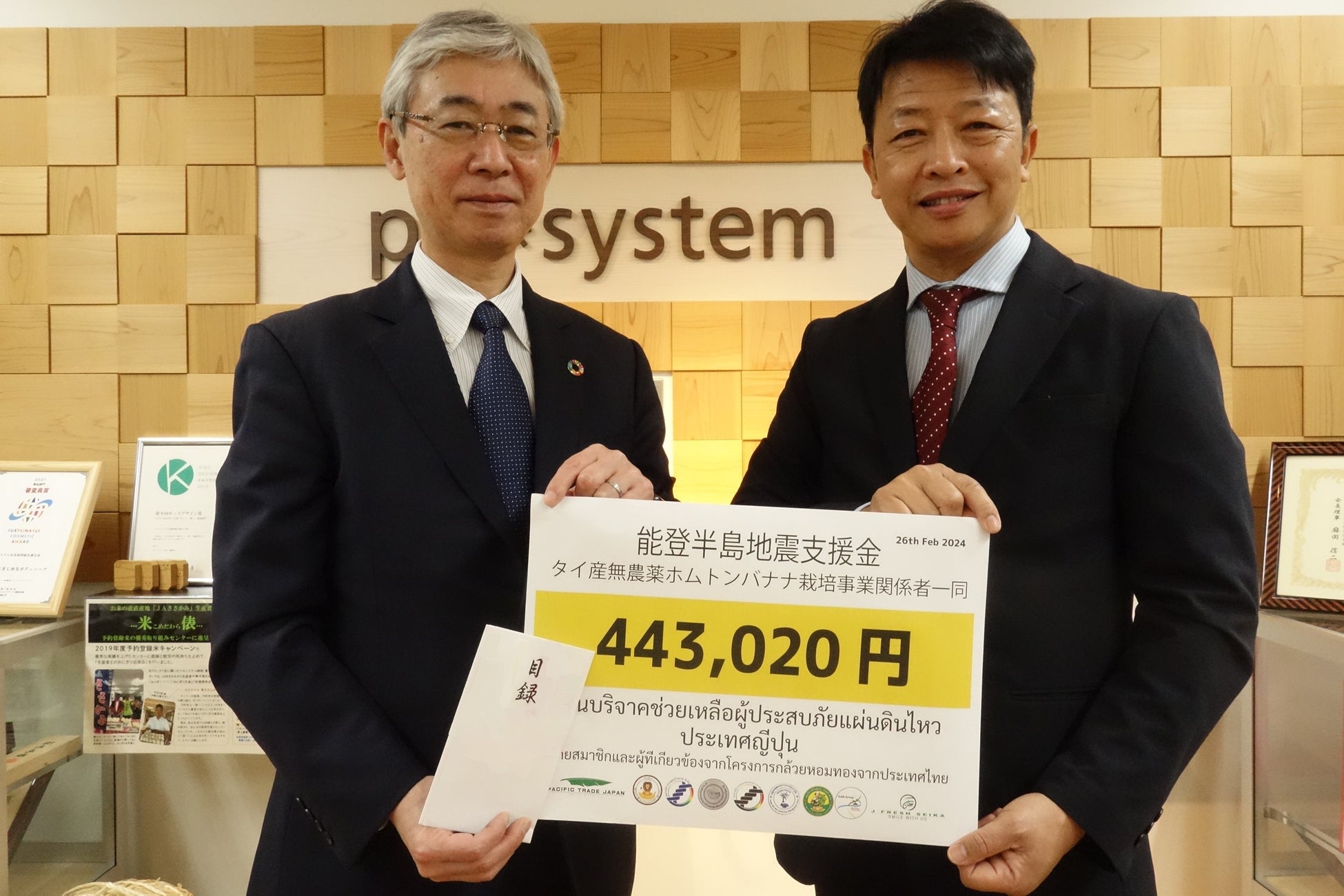 パルシステムが宅配で届けるタイ産「エコ・バナナ(ホムトン)」の生産者から、能登半島地震で被災したみなさんに支援金44万3,020円が寄せられました。募金は先方の意向からパルシステムが1月に呼びかけた能登半島地震緊急支援募金として、被災されたみなさんの生活再建や地域の復興などに役立てられます。