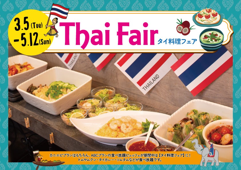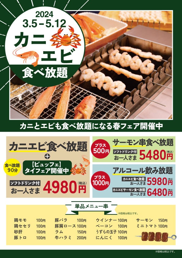 この度、3月5日(火)から5月12日(日)までの間『カニエビ食べ放題』を開催いたします。また、ビュッフェコーナーでの『タイ料理フェア』も同時開催。