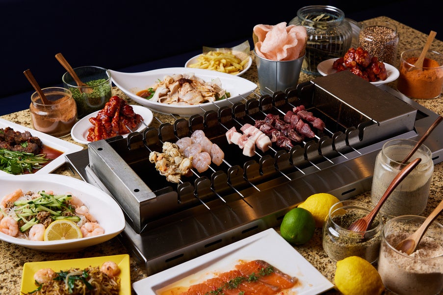 「スパイスBBQ×食べ放題 Nicole」は、全卓に自動回転串焼き機を設置した新しい形のバーベキューレストラン。自動回転串焼き食べ放題に加えて豊富なビュッフェを楽しむことができます。
