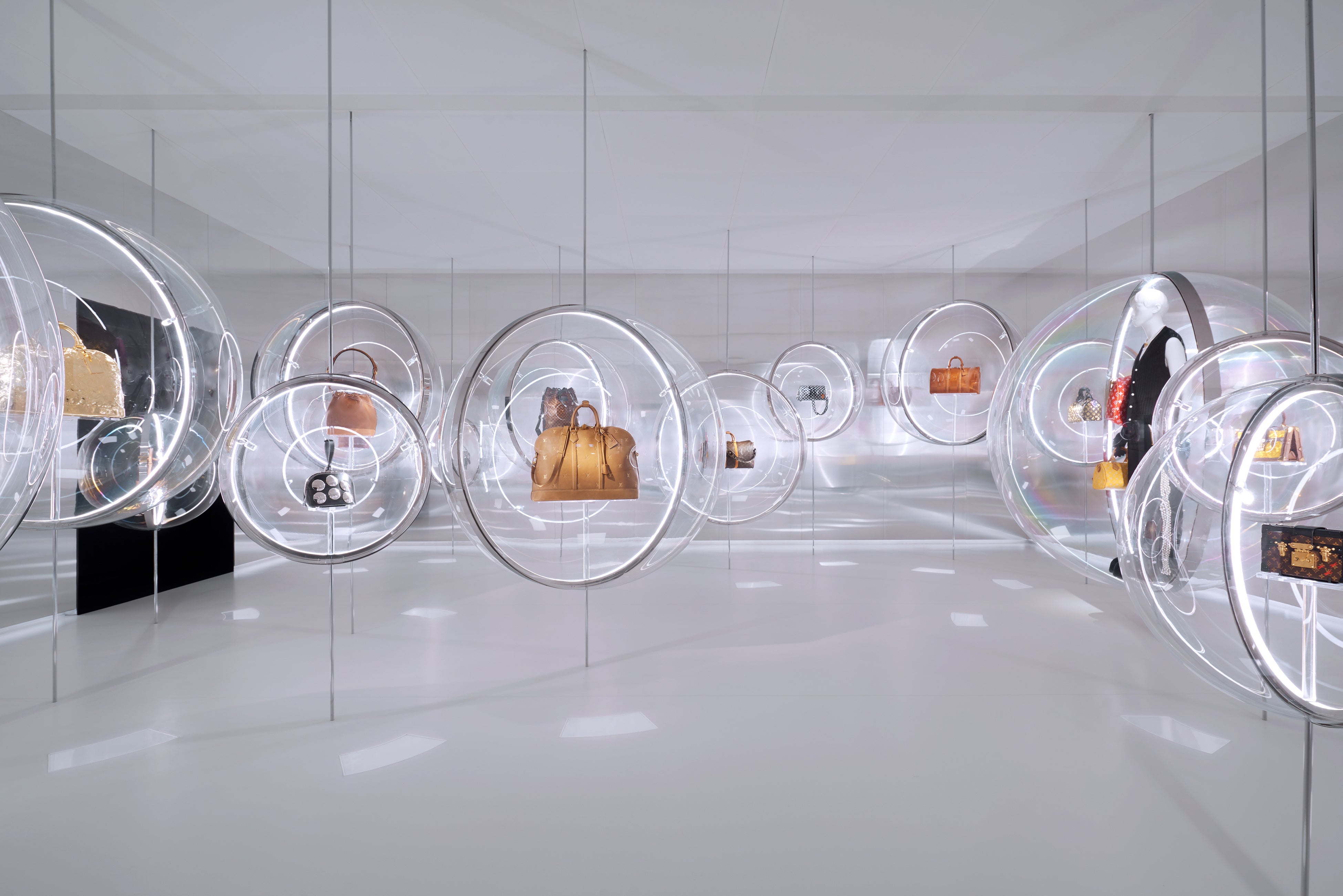 「Iconic Bags」のルームでは、さまざまなアイコンのユニークな形やフォルム、そして重要性を伝えるためにバッグ21点とプレタポルテ2ルックを展示。それらを閉じ込めた透明なアクリルバブルがバッグの形とフォルムを際立たせます。空中に吊り下げられた ルイ・ヴィトンの影響力を感じさせるいくつもの球体は、時を超えた発明とその集合的なストーリーを星空のように表現しています。