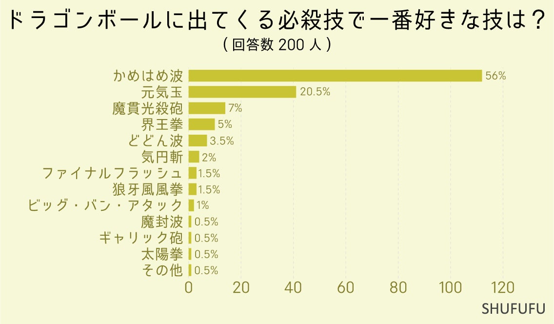 ドラゴンボールに出てくる必殺技で一番好きな技は?を尋ねたところ、1位は「かめはめ波(56%)」、2位「元気玉(20.5%)」となりました。