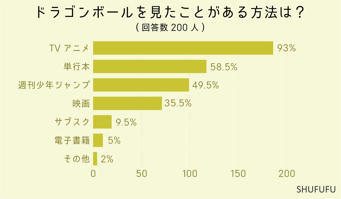 ドラゴンボールを見たことがある方法は?(複数選択可)の問いに対して最も多かったのが「TVアニメ(93%)」でした。 次いで「単行本(58.5%)」「週刊少年ジャンプ(49.5%)」という結果でした。
