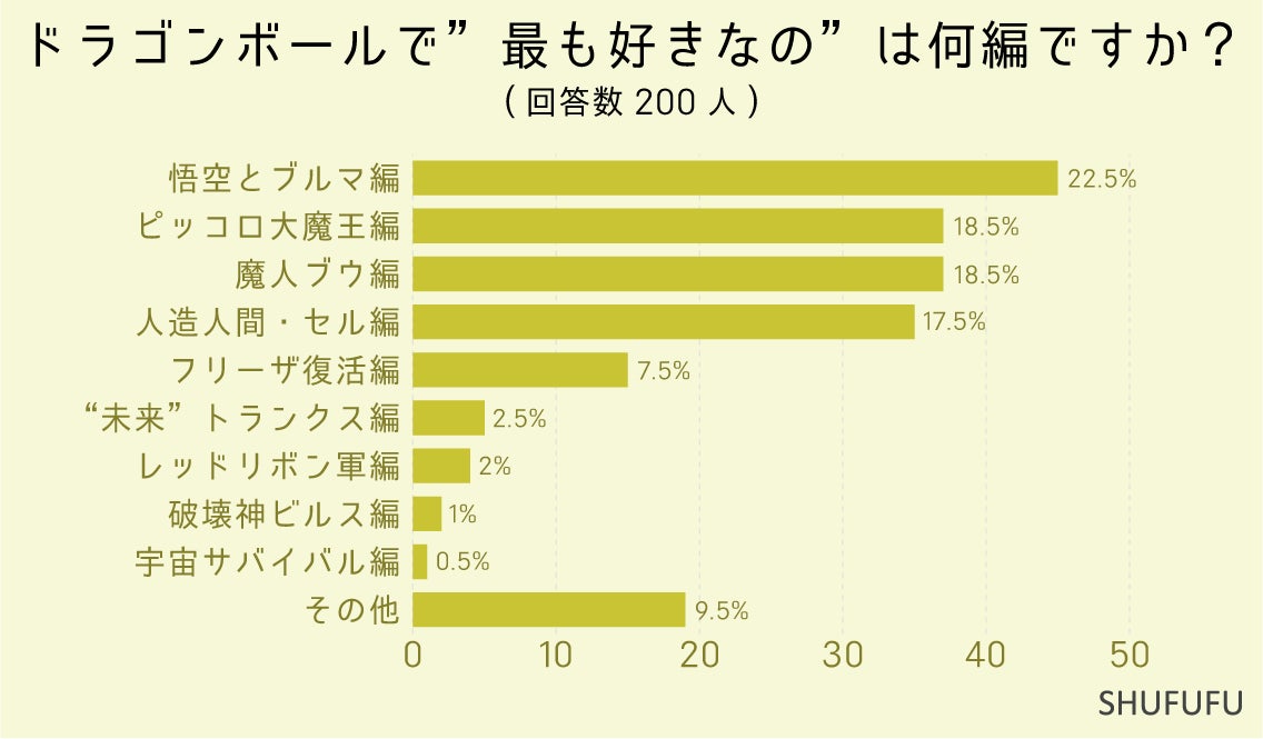 ドラゴンボールで”最も好きなの”は何編ですか?に関しては1位「悟空とブルマ編(22.5%)」、2位「ピッコロ大魔王編(18.5%)」でした。「悟空とブルマ編」はドラゴンボールの始まりの物語ということもあり人気が高いようですね。