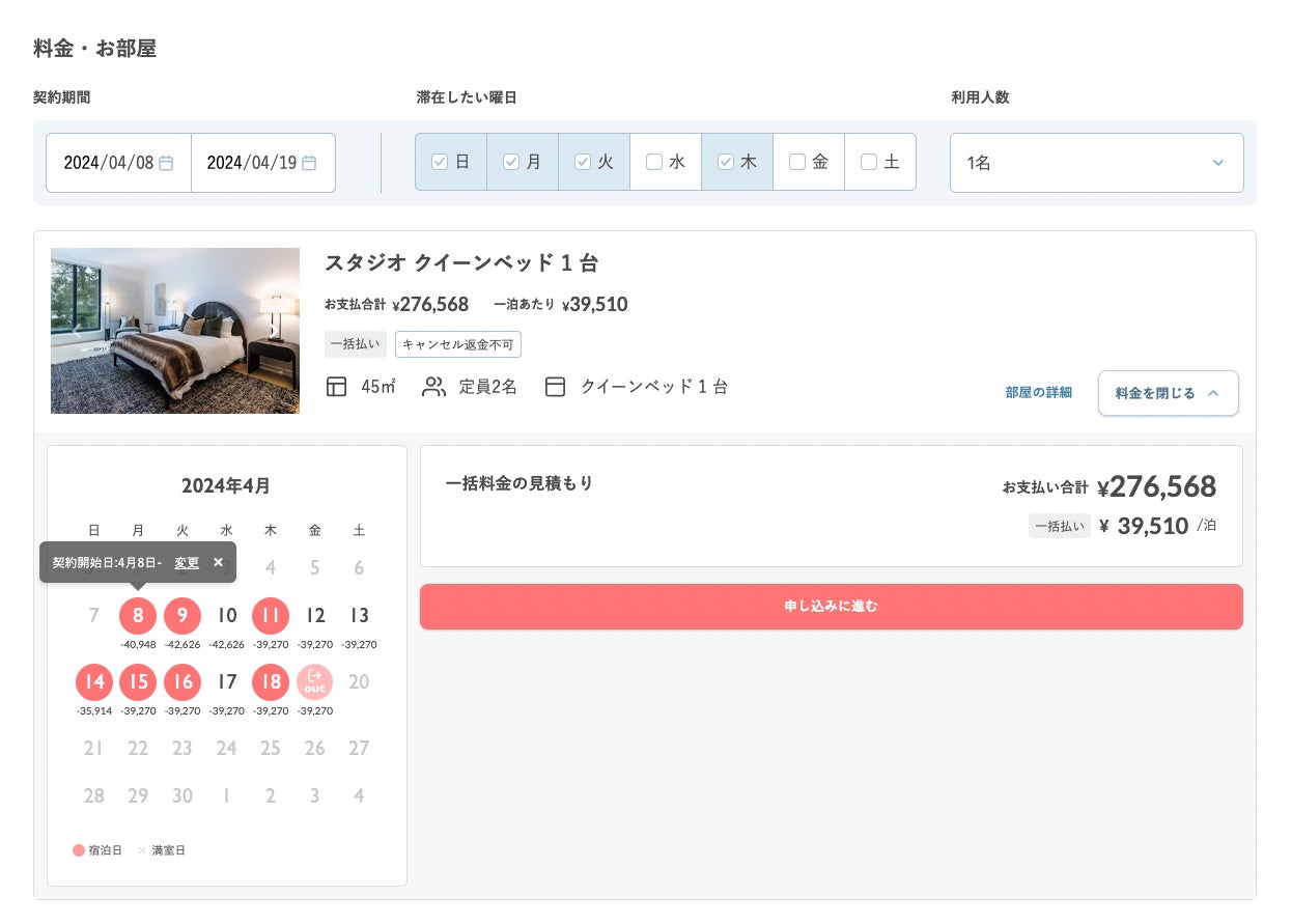 予約システムの機能アップデートにより、一泊からの宿泊予約も可能になりました。長期滞在から短期滞在、ホテル利用など、ニーズにあわせたご利用が可能です。