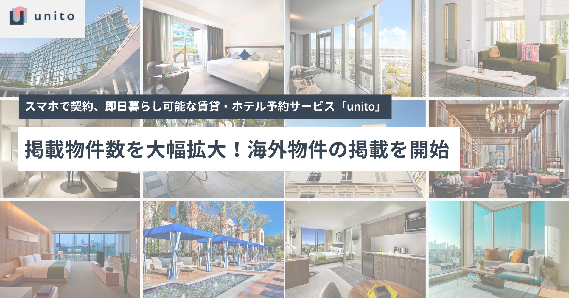 株式会社Unito(本社:東京都千代田区、代表取締役:近藤佑太朗)は、米国最大手の旅行会社と提携し、最短即日入居・スマホ契約可能な家具家電付きのお部屋を探せるプラットフォーム「unito」の掲載物件数を2,169施設拡充し、海外物件の掲載を開始したことをお知らせします。