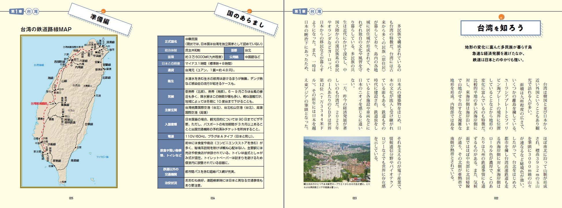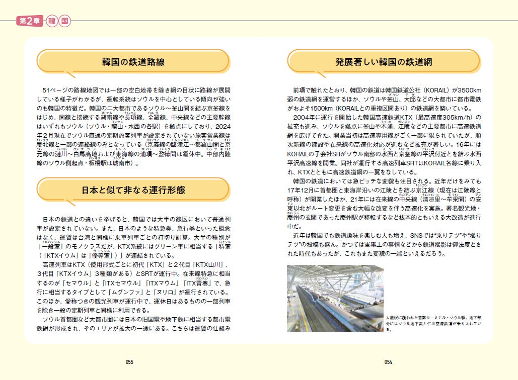 本書では、日本から比較的近く、渡航手続きや治安面などの点からも訪問しやすい台湾、韓国、タイ、マレーシア、ラオスの5つの国と地域を取り上げ、各渡航先の基本情報はもちろん、鉄道路線網のあらまし、鉄道運営会社と運行スタイル、主要駅の紹介、きっぷの予約・購入方法、鉄道利用時の注意事項など、日本との違いを解説しています。