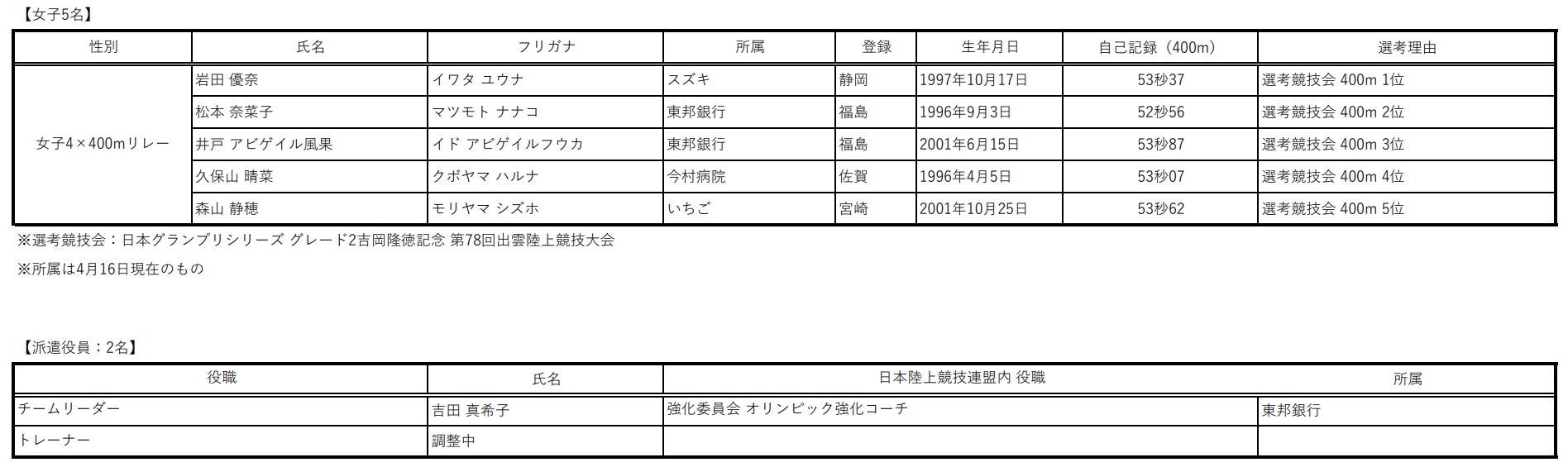2024年5月20日(月)~21日(火)にバンコク(タイ)で開催される「バンコク2024アジアリレー」に派遣する日本代表選手が別紙の通り決定しましたのでお知らせいたします。