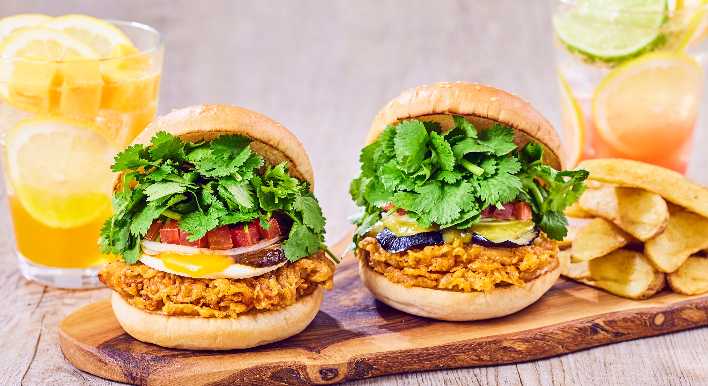 グリーンカレーソースと店内で生のチキンに衣をつけて調理したジューシーなフライドチキンをサンドした毎年大好評の商品の再販とともに、今年は、バジルとナンプラーの香りが食欲をそそるガパオソースに、フライドチキンと目玉焼きをトッピングした「パクチーチキンバーガー ガパオ」が新登場。