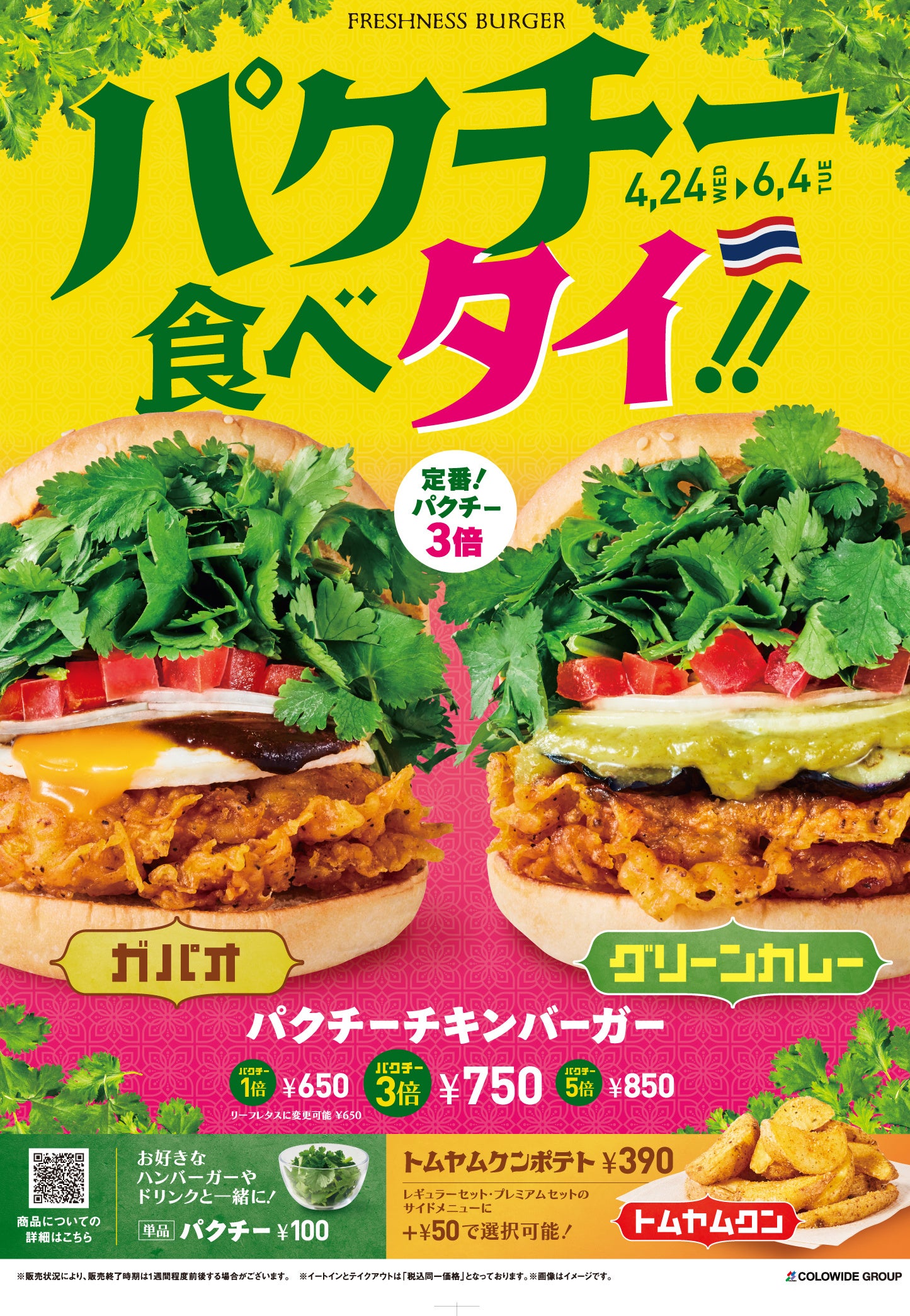 「パクチーチキンバーガー ガパオ」「パクチーチキンバーガー グリーンカレー」「トムヤムクンポテト」2024年4月24日(水)~6月4日(火)までの期間限定