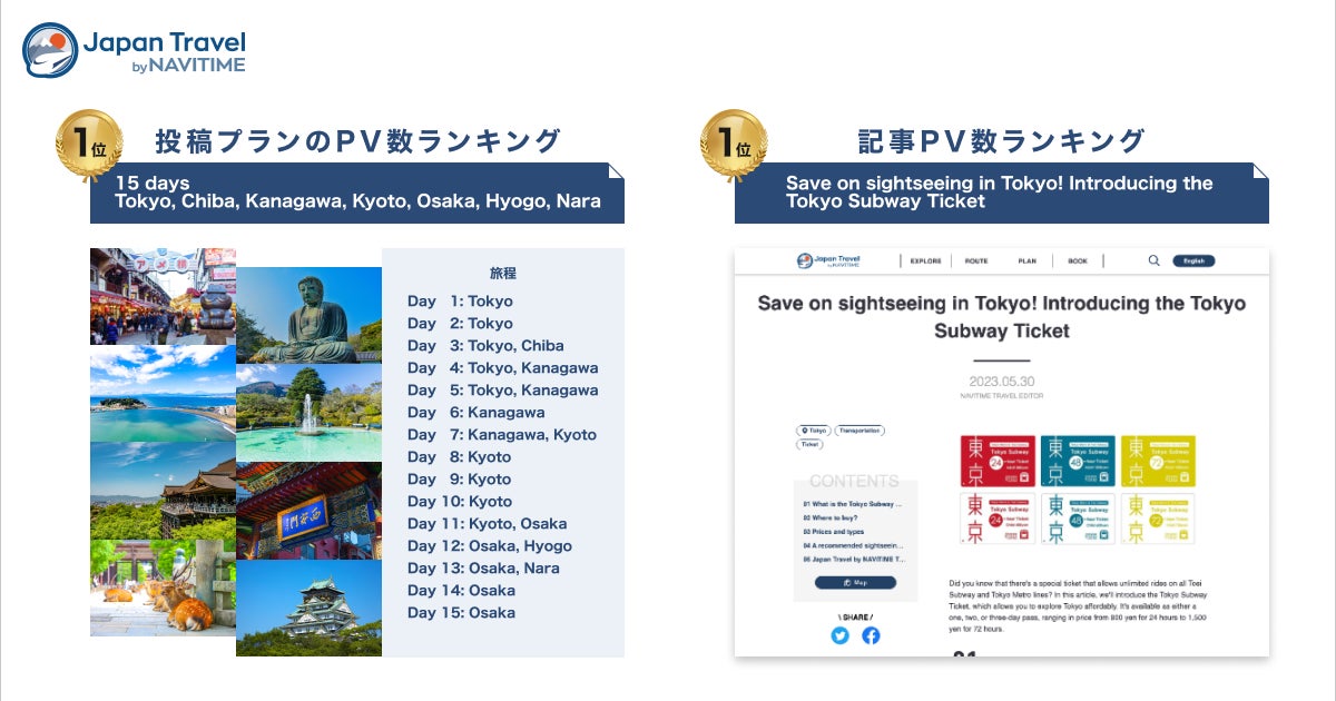 観光コンテンツとして、観光ガイドや移動に関するHow To記事を提供しています。「Tokyo Subway Ticket」や「JAPAN RAIL PASS」など周遊パスの活用方法や、「リアルタイムの鉄道運行情報」「ICカードの払い戻し方法」「天候情報」「荷物の預け方」など、交通・移動に関する記事が多く閲覧されています。また、レストラン情報や、旅行体験のシェア方法、歓楽街の治安に関する記事もランクインしています。