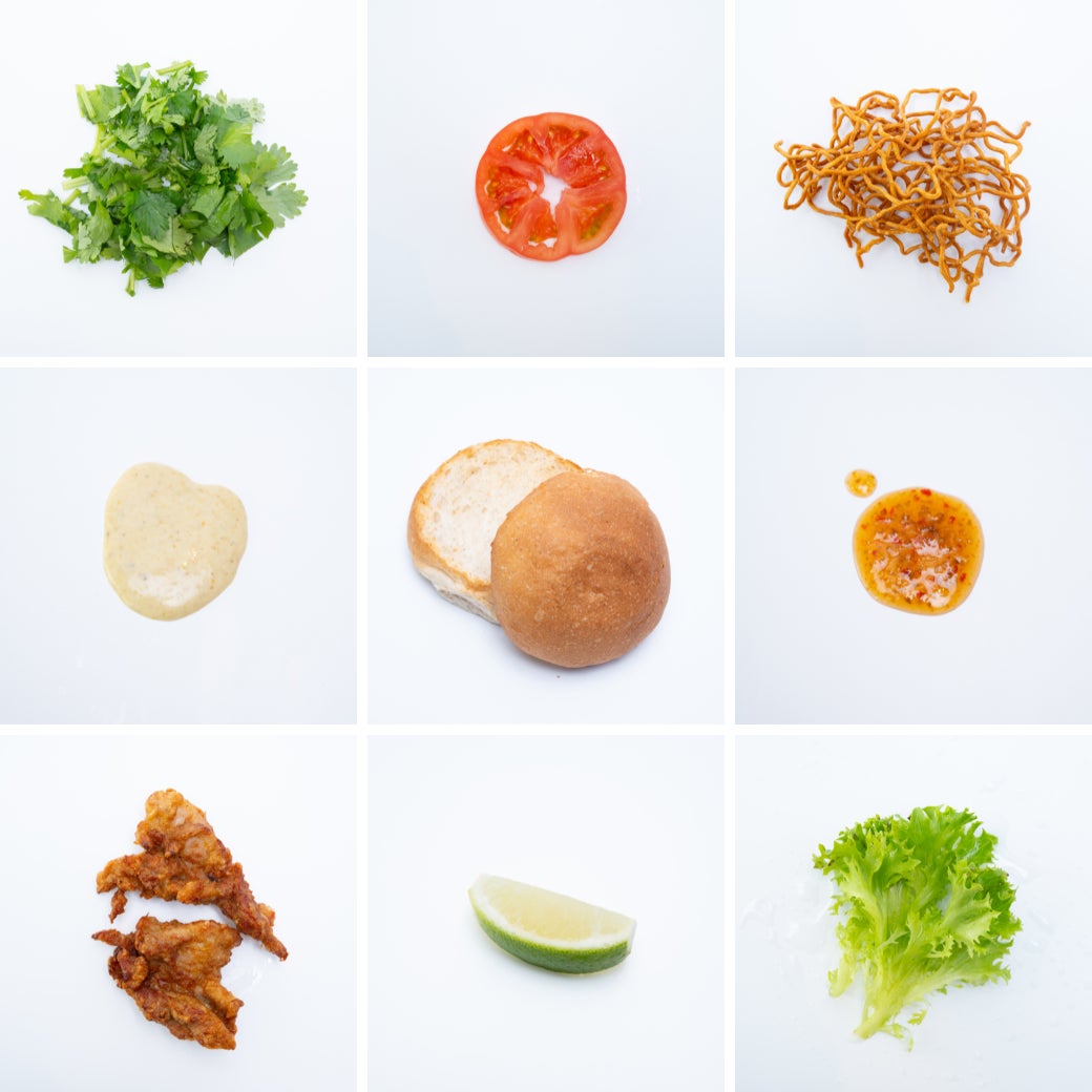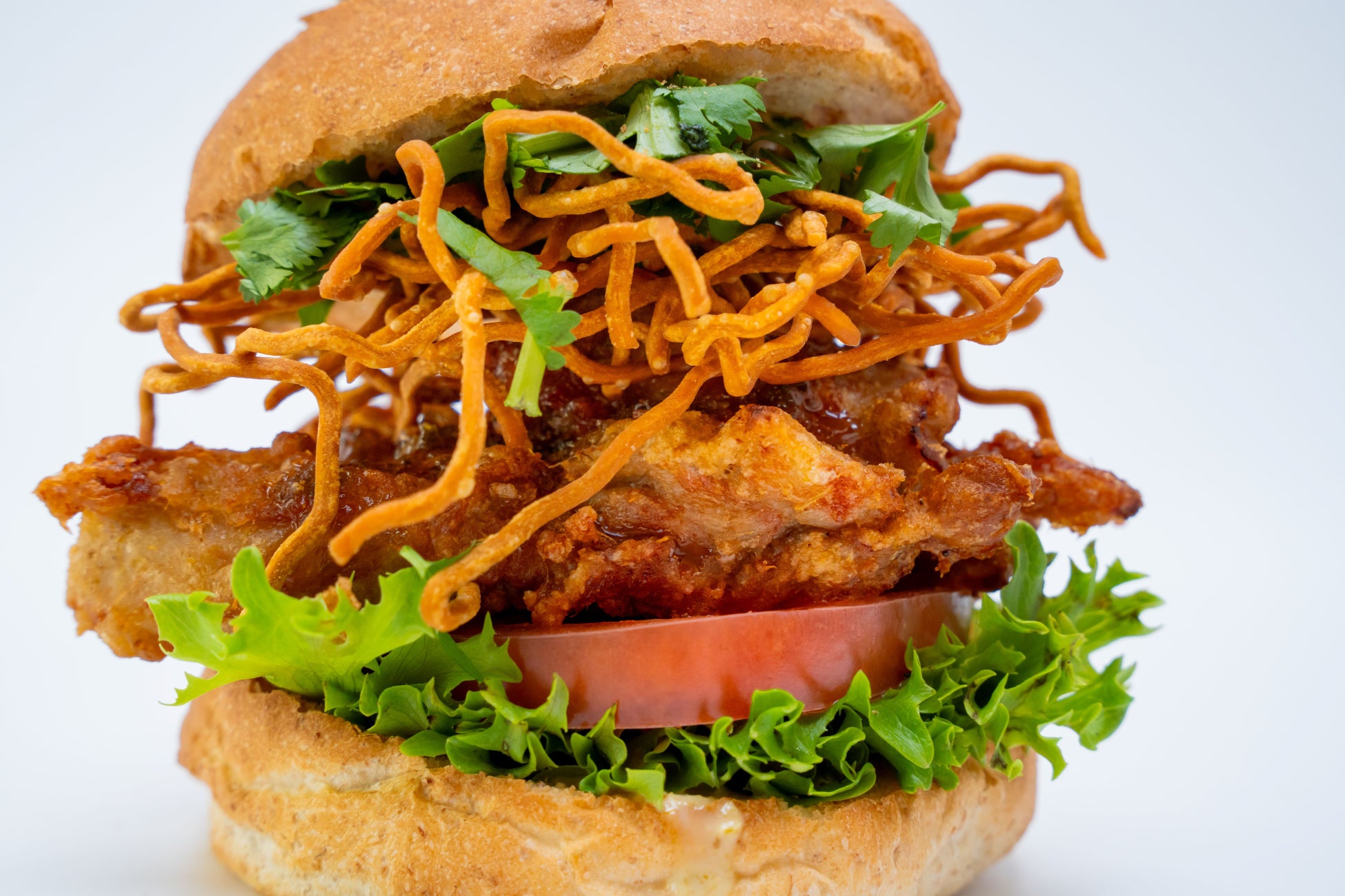 今回のハンバーガー、最初に目に入るのはなんといってもこのパリパリの揚げ麺。タイ北部で親しまれている『カオソーイ』というカレーラーメンから着想を得ました。”カオ”はタイ語で”米”、”ソーイ”は”麺”を意味します。パリパリに揚がった麺はバンズとケンカするのでは?と思いきや、食感が程よいアクセントに。