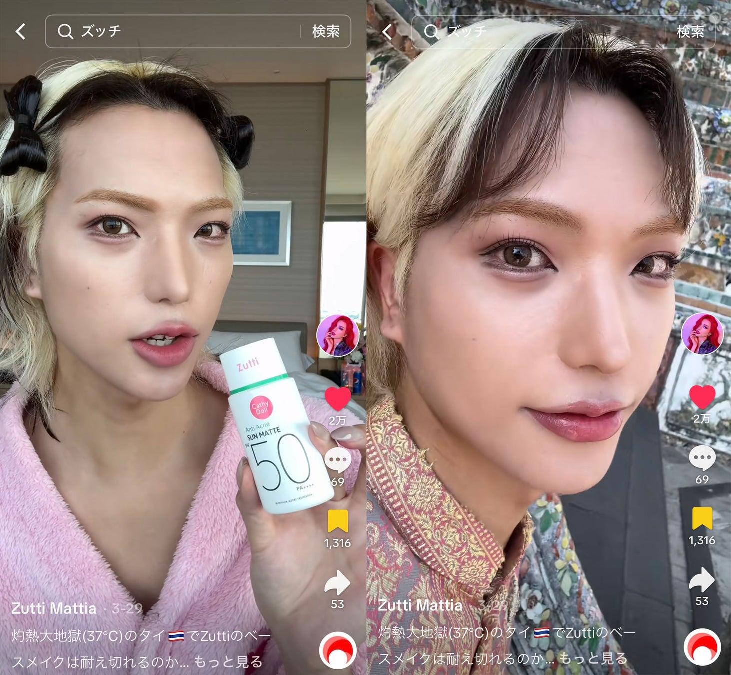 「CathyDoll(キャシードール)」のジャパンアンバサダー 、SNS総フォロワー110万*超えのZutti Mattiaが、高温多湿なタイ**で実際に「サンマット」を使用して、崩れにくさを検証。