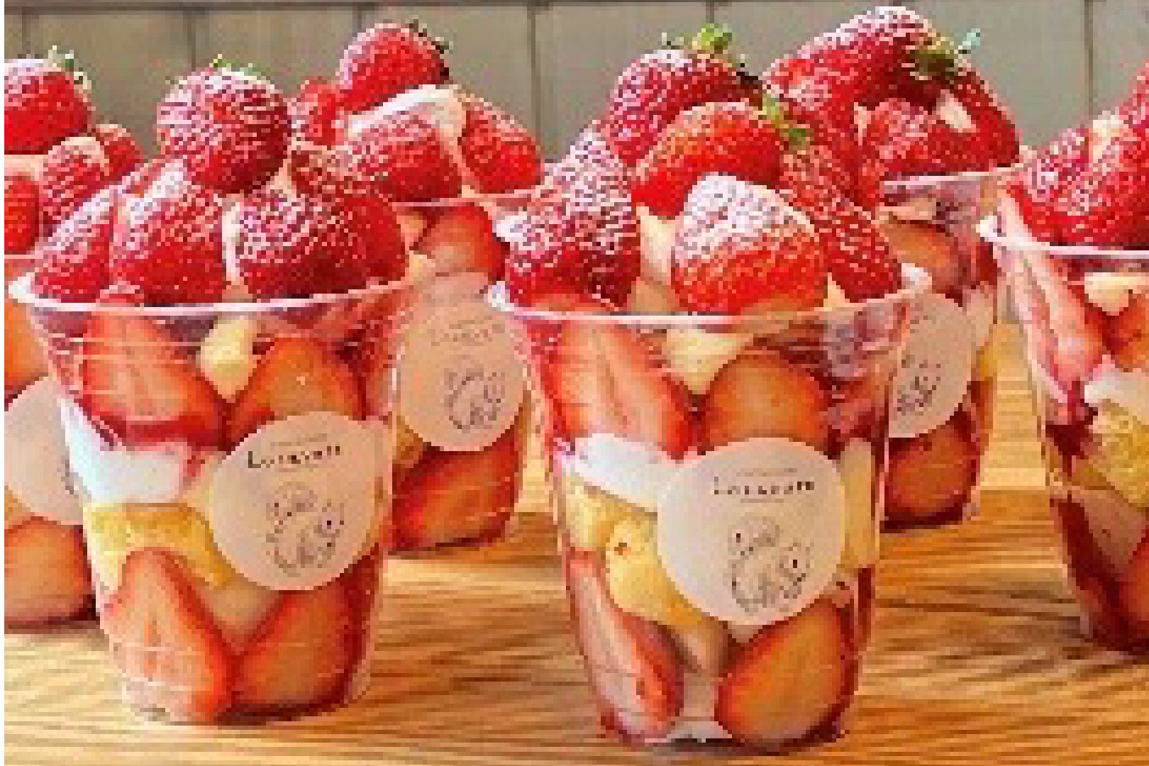 上より、佐賀牛がぎっしり「ステーキサンド」・キッチンカーで人気の「博多ホルチャン」・八女のいちご農園から「朝摘み苺のパフェ」・熊本から出店のポテチ専門店