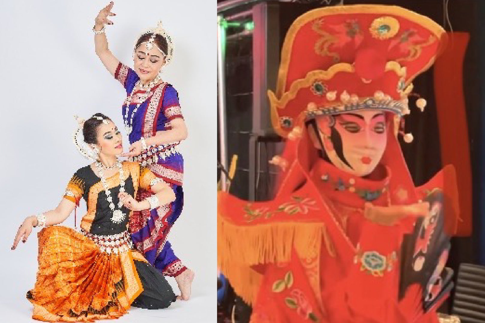 左上より、東インド古典舞踊、心心による「変面」、和太鼓集団「「打賊 野武士」、「福岡朝鮮歌舞団」、「ハニーズダンスアカデミー」※出演者の一部となります。