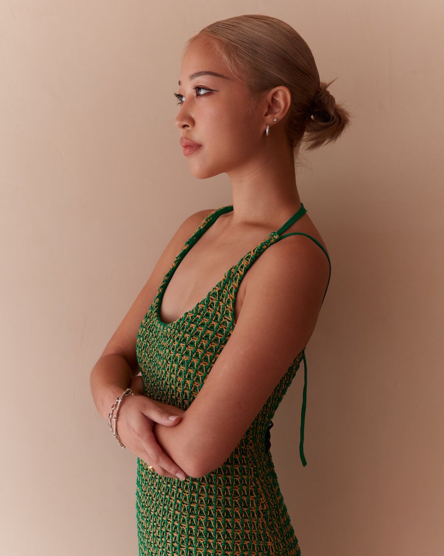 タイの伝統的なブレスレットからインスパイアされた楕円形の石が使われています。彼女はこのコンセプトに基づきつつ、より現代的なデザインに再構築することで、このブレスレットをより多くの人に親しみやすいものにし、自身の文化に敬意を表しています。