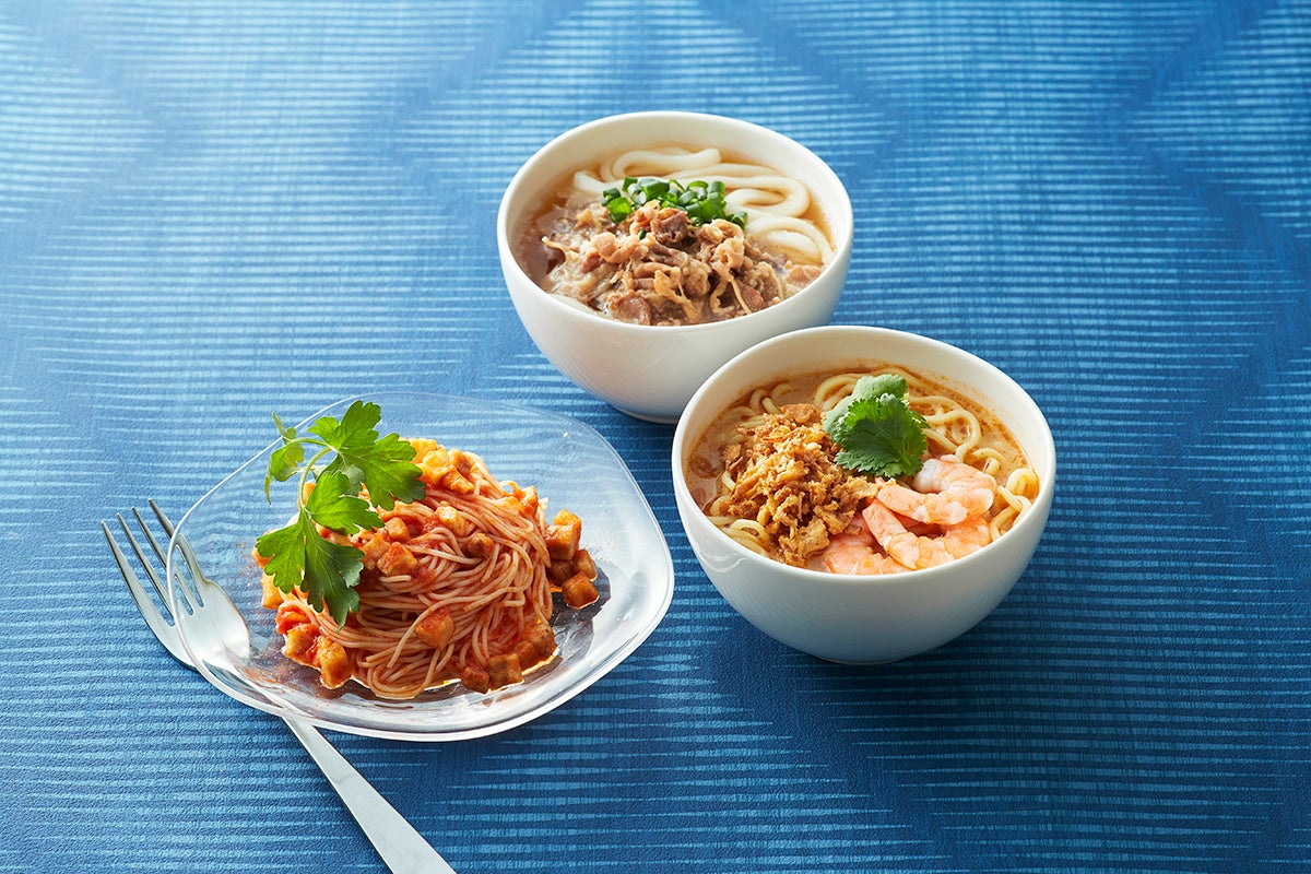 トムヤムヌードル、水茄子とトマトのカッペリーニ、肉うどん、桃とゴルゴンゾーラのピッツァ、ラタトゥユ風ピッツァなど。
