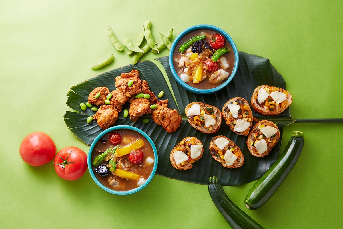 魚介と夏野菜のスープカレー、タンドリーチキン、カレー風味のラタトゥユとモッツァレラチーズのブルスケッタ、バーベキューチキンのピッツァ、トウモロコシとベーコンのピッツァなど。