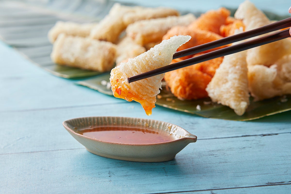 【網春巻き(3種)】網状のライスペーパーで包んで揚げた春巻き。海鮮と海老、貝柱の3種の味と、パリパリの食感をお楽しみください。
