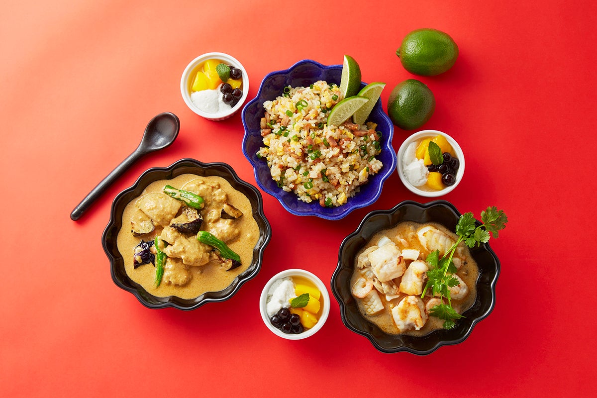 鶏肉のココナッツミルク煮込み、タイ風チャーハン、魚介のトムヤムクン、ソーセージとパイナップルのピッツァ、夏野菜とキーマカレーのピッツァなど。