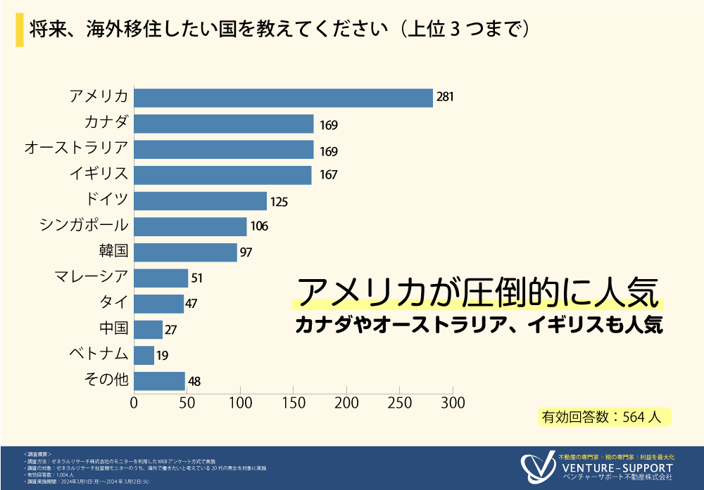海外移住先として「アメリカ」が人気。「カナダ」「オーストラリア」「イギリス」も