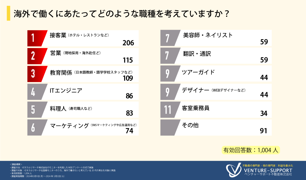 半数が海外で「1年以上」働きたいと回答。希望する職種は「接客業(ホテル・レストランなど)」が最多