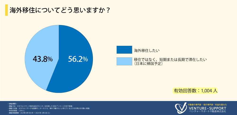 「海外移住についてどう思いますか?」と質問したところ、「海外移住したい(56.2%)」「移住ではなく、短期または長期で滞在したい(日本に帰国予定)(43.8%)」という回答結果になった。