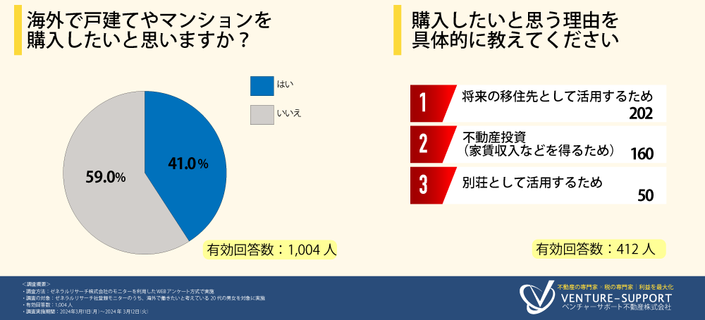 4割が「海外で戸建てやマンションを購入したい」と回答。「将来の移住先」「不動産投資」を目的に