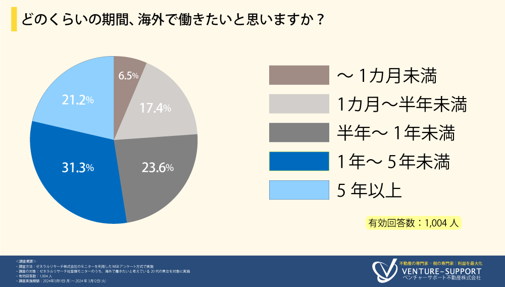 「どのくらいの期間、海外で働きたいと思いますか?」と質問したところ、「1年~5年未満(31.3%)」と回答した人が最も多く、次いで「半年~1年未満(23.6%)」「5年以上(21.2%)」「1カ月~半年未満(17.4%)」「1カ月未満(6.5%)」と続いた。