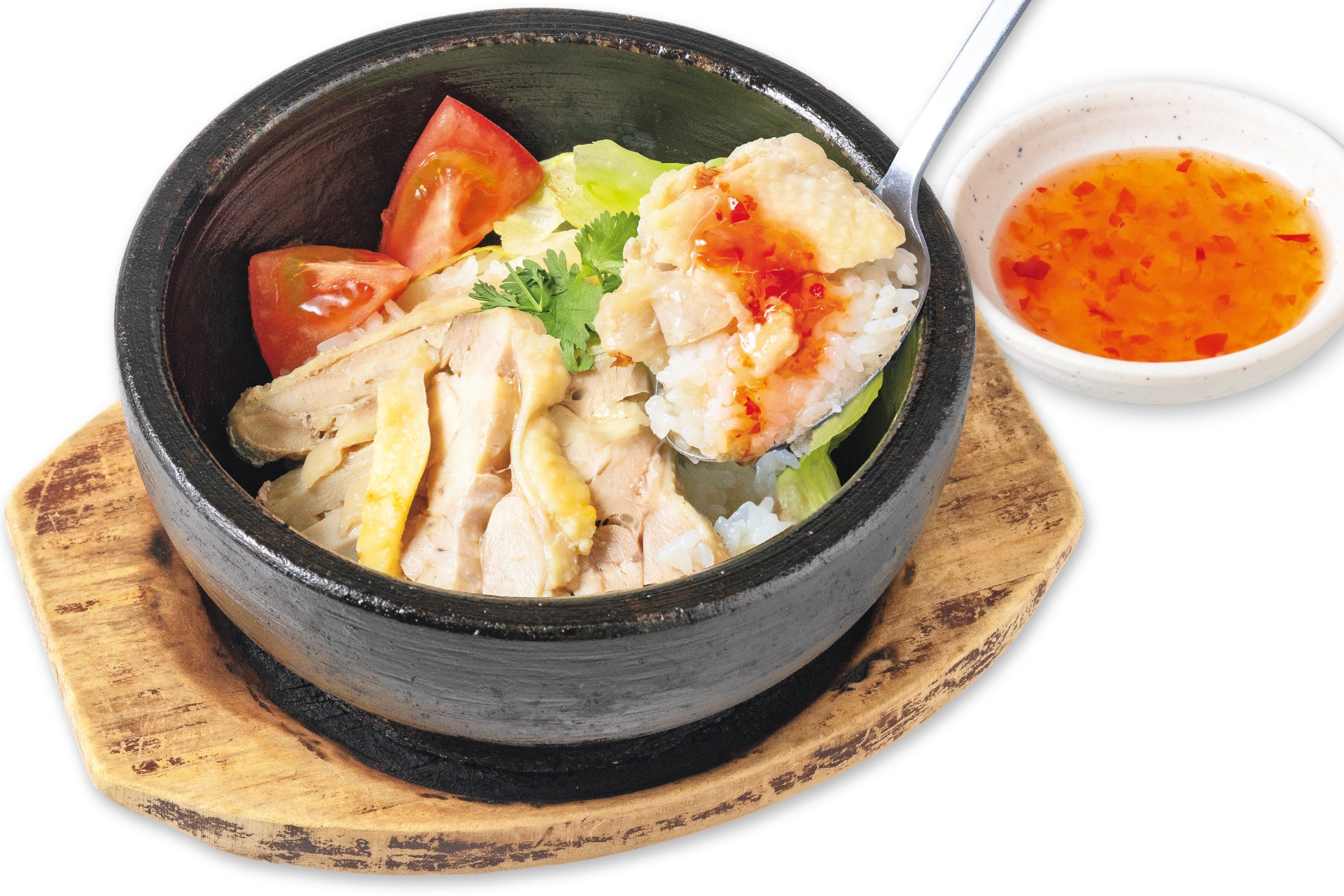 ゆで鶏のぶつ切りを味付けご飯にのせた一品。お好みでスイートチリソースをかけてお召し上がりください。