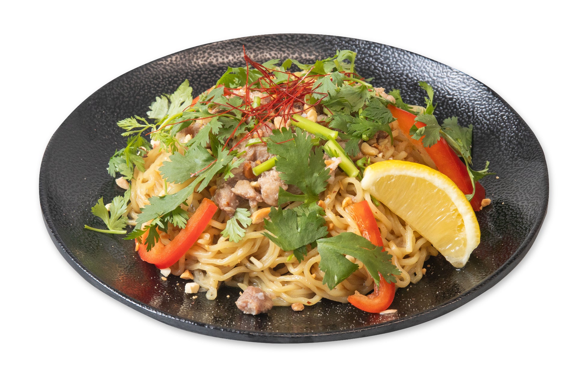 パクチーを盛り付けた、タイ風の汁なし混ぜそば。レモンを絞ってさっぱりとした味わいに。