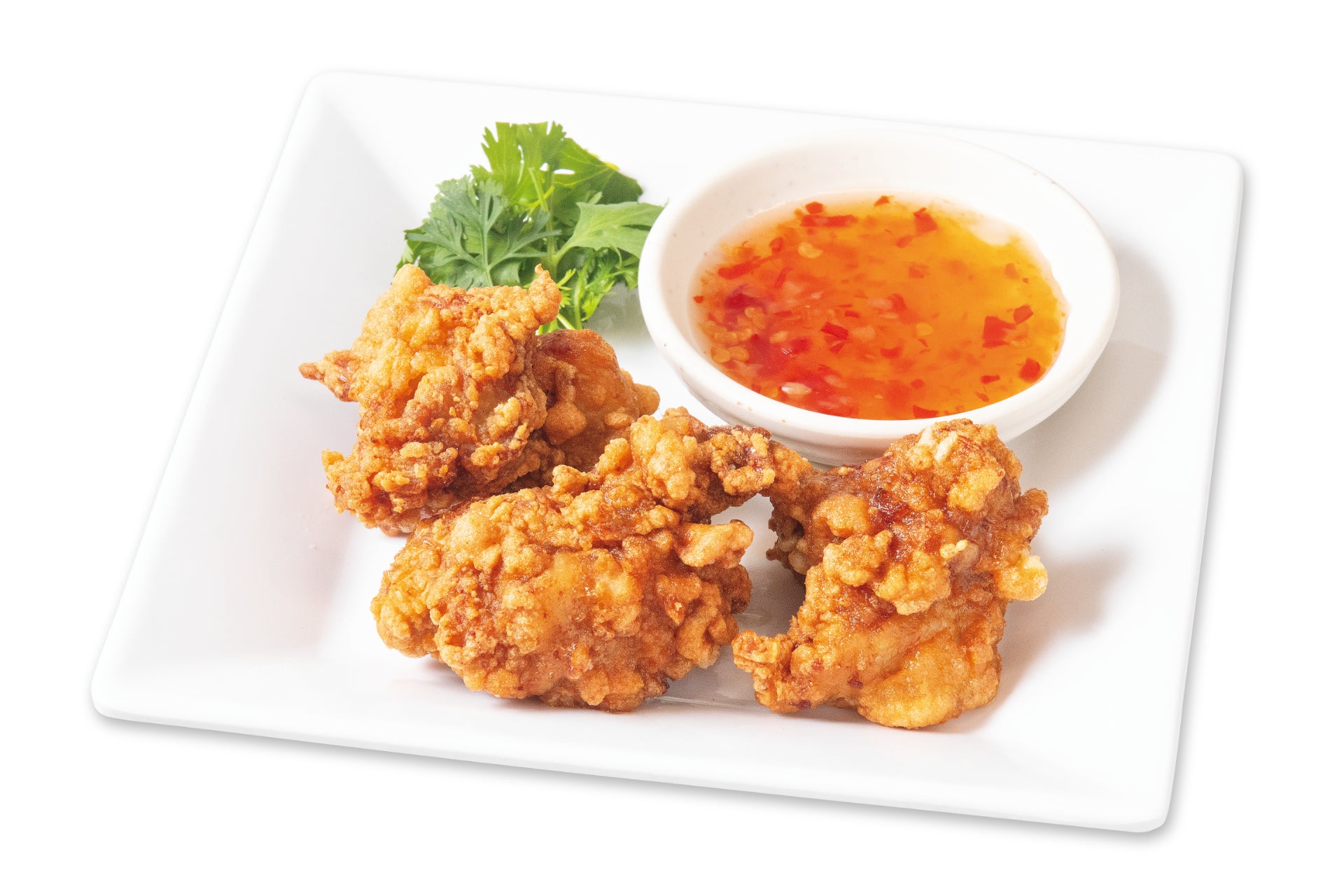 相性抜群のスイートチリソースで食べるタイ風唐揚げ。お好みでパクチーとご一緒にどうぞ。
