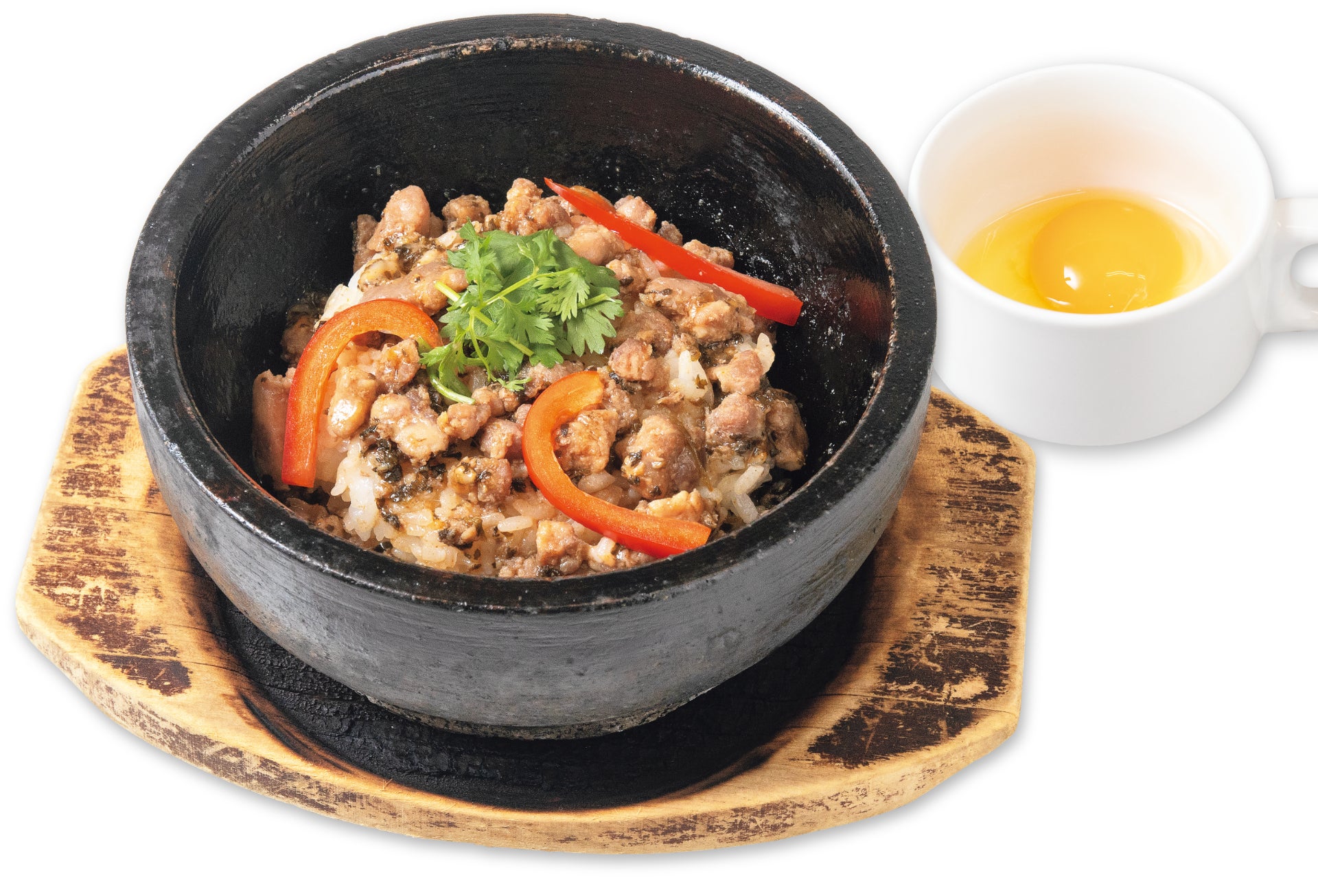 人気のガパオライスを石焼で。別皿の生卵を入れて、よくかき混ぜたら完成です。