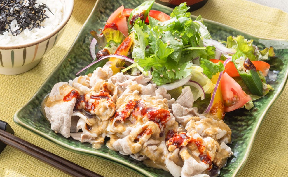 濃厚な胡麻だれは、豚の冷しゃぶのさっぱりとした味わいを引き立て、しそひじきご飯との相性も抜群。隠し味にレモングラスを加えた胡麻だれは、エスニックな香りが豊かで食欲をそそります。味変にお好みで特製ラー油をかけて“さっぱりピリ辛”でお召し上がりください。