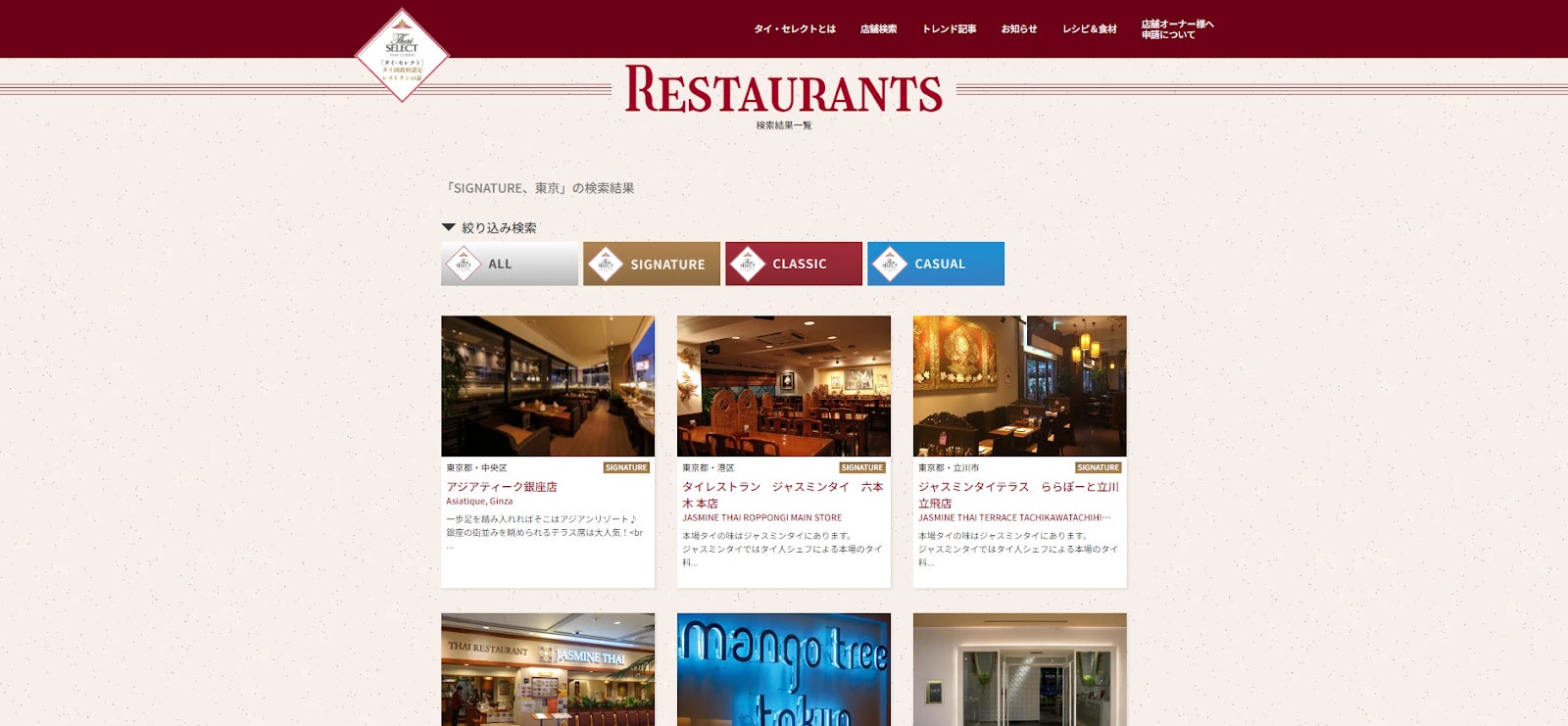 タイ・セレクト公式サイト(https://thaiselect.jp/about/) では、タイ国商務省の厳しい審査に合格した、日本国内にあるタイ・セレクト認定レストランを全店舗紹介しています。実際に足を運び、本場のタイ料理をぜひお楽しみください。