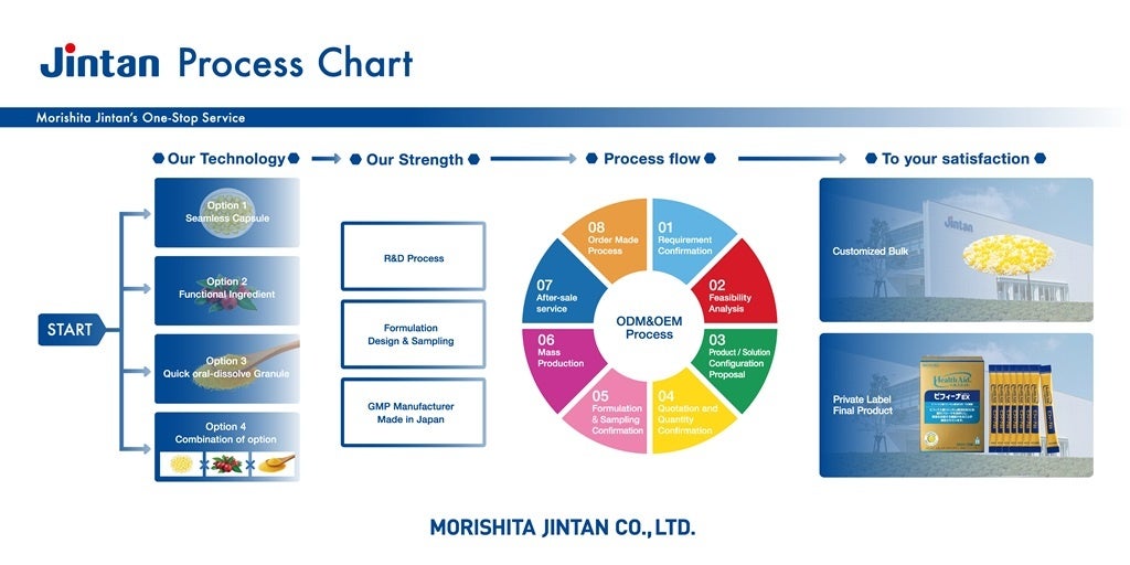粉末から液体までを包み、皮膜には耐酸性、耐熱性など様々な機能を持たせることができる当社独自の「シームレスカプセル」技術を利用したOEM受託を行っています。受託における、企画・設計・製造・包装までをトータルサポートいたします。