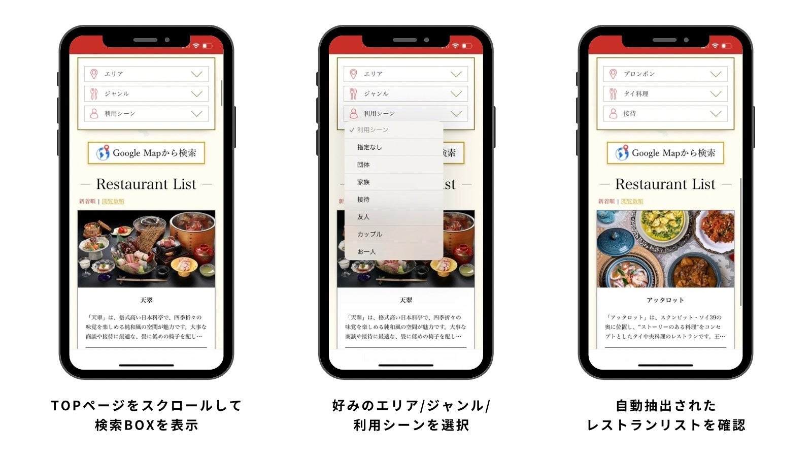 ✔ 厳選されたレストランをエリア、ジャンル、利用シーンに応じて効率的に検索可能