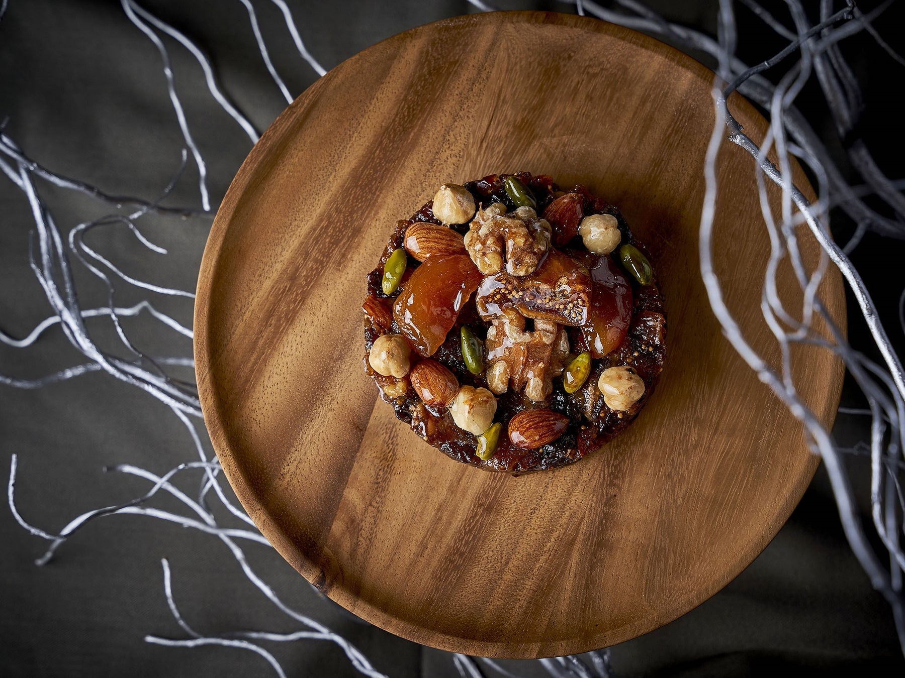 ベラベッカとは、フランス・アルザス地方に伝わるクリスマスを代表する伝統的なお菓子で「洋ナシのパン」を意味します。キルシュと呼ばれるフルーツブランデーに漬け込んだドライフルーツの洋ナシを中心に、10種類以上のミックスフルーツやナッツをふんだんに使用し、濃厚な味わいと食べ応えを楽しめるスイーツです。一般的にナッツは生地の中に混ぜ込まれますが、センタラでは表面にも並べることで、食感も楽しく見た目にも美しく仕上げました。さらにドライ無花果とアプリコットをトッピングし、その程よい酸味がバランスの取れた味わいを演出します。