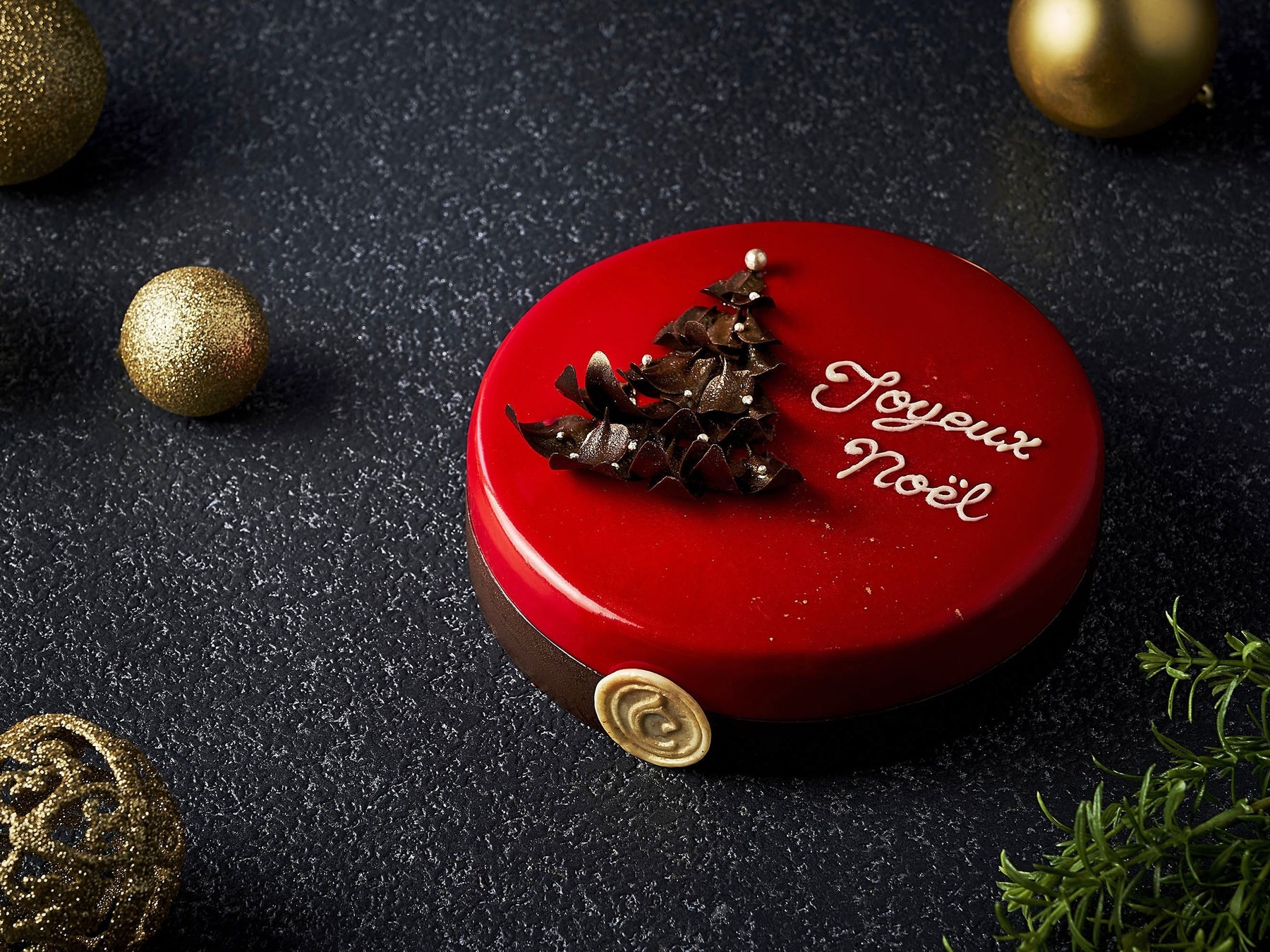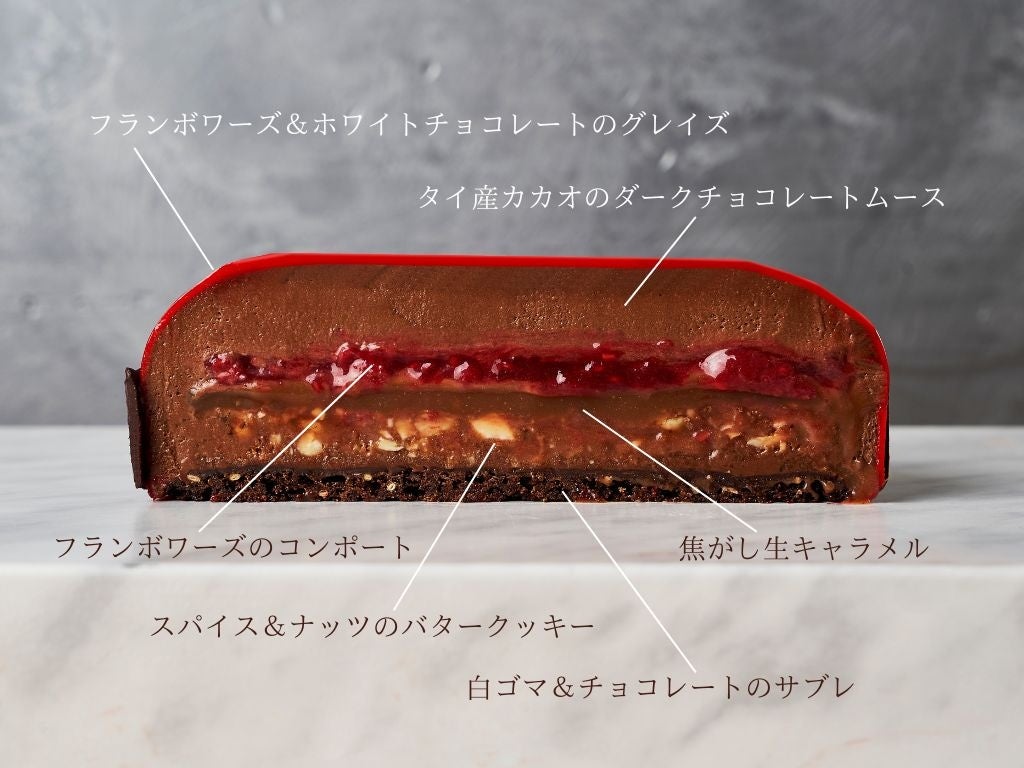まずケーキ底には白ゴマとチョコレートのサブレがスタンバイ。ケーキ中央には3つの層が重なり合い、シナモンやミックスナッツを丁寧にバターでソテーした層、その上にはとろける焦がし生キャラメル、さらにフランボワーズ100%のジュ―シーなコンポートが贅沢なハーモニーを演出。この3層を覆う高カカオのダークチョコレートムースは、ベルベットのようにきめが細かく、雪のように滑らかでありながら甘さは控えめで、瑞々しいベリーや生キャラメル、さくさくのナッツなどを包み込みバランスの取れた味わいに。パティシエが厳選しタイから取り寄せたカカオと、雪のように口の中でとろけるキャラメルやコンポートに魅了されるクリスマススケーキと共に特別な1日をお過ごしください。