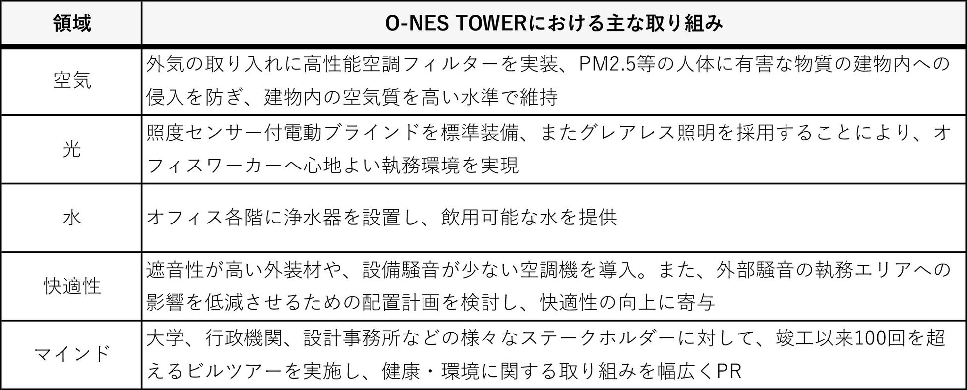 O-NES TOWERでは本認証取得にあたり、「高性能空調フィルターによる外気の取り入れ」や「照度センサー付電動ブラインドの標準装備、グレアレス照明の採用」など、オフィスワーカーにとって健康で心地よい環境づくりが評価されました。