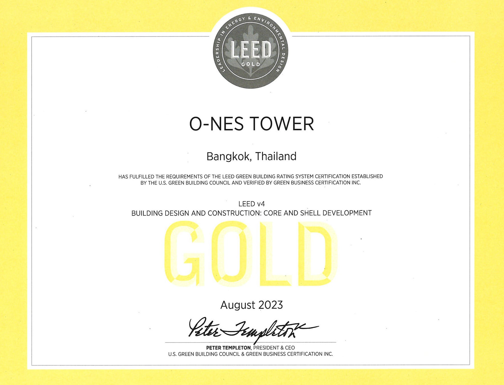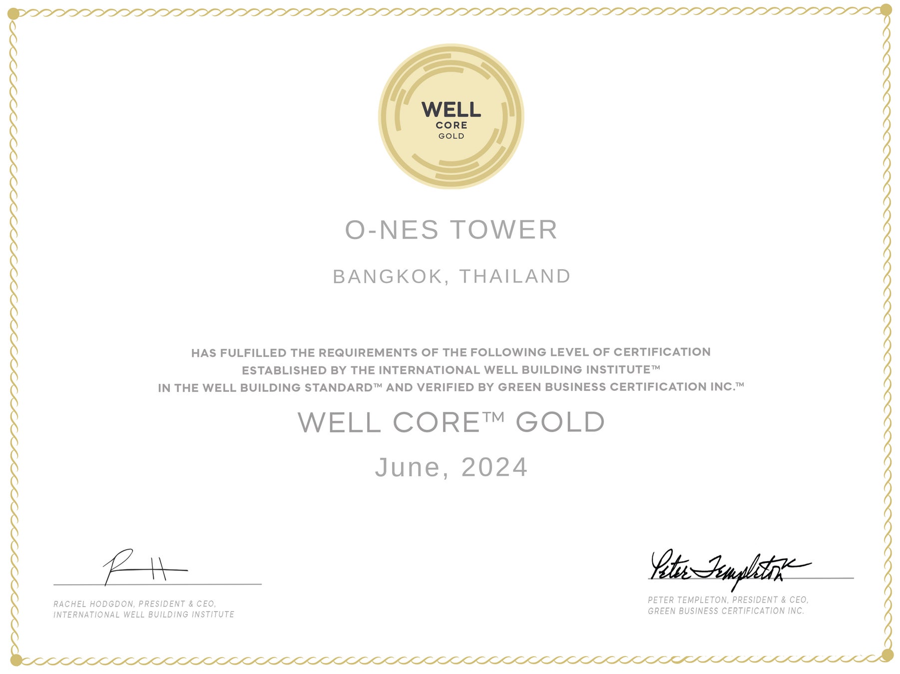 株式会社大林組(本社:東京都港区、社長:蓮輪賢治)のグループ会社であるタイ大林(本社:タイ・バンコク、社長:ポーンチャイ・シティヤコーン)が開発した大型賃貸オフィスビル「O-NES TOWER」は、このたび健康やウェルビーイングの観点から施設空間を評価する国際的な認証制度「WELL Building Standard(以下、WELL認証)(※1)」のオフィス及び商業区画の共用部を対象とした「WELL Core (v.1)」において、「ゴールド」を取得しました。