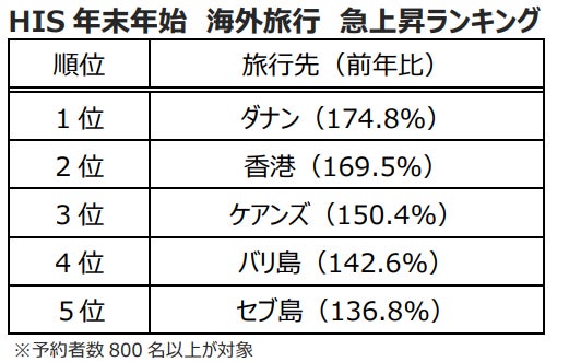 前年より大幅に予約者数が増加した方面としては、1位にベトナムのビーチリゾート、ダナンがランクインしました。ベトナム航空の成田路線における期間限定の機材の大型化や地方空港発着でのチャーター就航など、座席供給数の増加により行きやすい環境になったことが影響していると考えられます。2位には香港がランクインしました。今年、HISではハーバーで花火と照明で新年を祝う「ニューイヤー・カウントダウン・セレブレーション」を特別エリアから鑑賞できるツアーを販売し好調に推移しております。3位にはオーストラリアのケアンズがランクインしました。ケアンズはコロナ前比でも151.4%と大きく伸びており、顧客層としては、お子様連れが57.8%と一番多く、時差も少ないことから家族旅行に人気となっております。4位にはインドネシアのバリ島がランクインしました。経済成長により以前より物価は上がったものの、大きく変動はしていないため、現地でかかる費用を抑えることができるのも魅力です。5位には予約者数ランキングでも7位に入ったフィリピンのセブ島がランクインしました。ケアンズ同様、お子様連れが62.9%と多く、直行便で約4時間半のフライト時間、4日間の短い日程から楽しめるということもあり、小さなお子様連れの方に人気です。