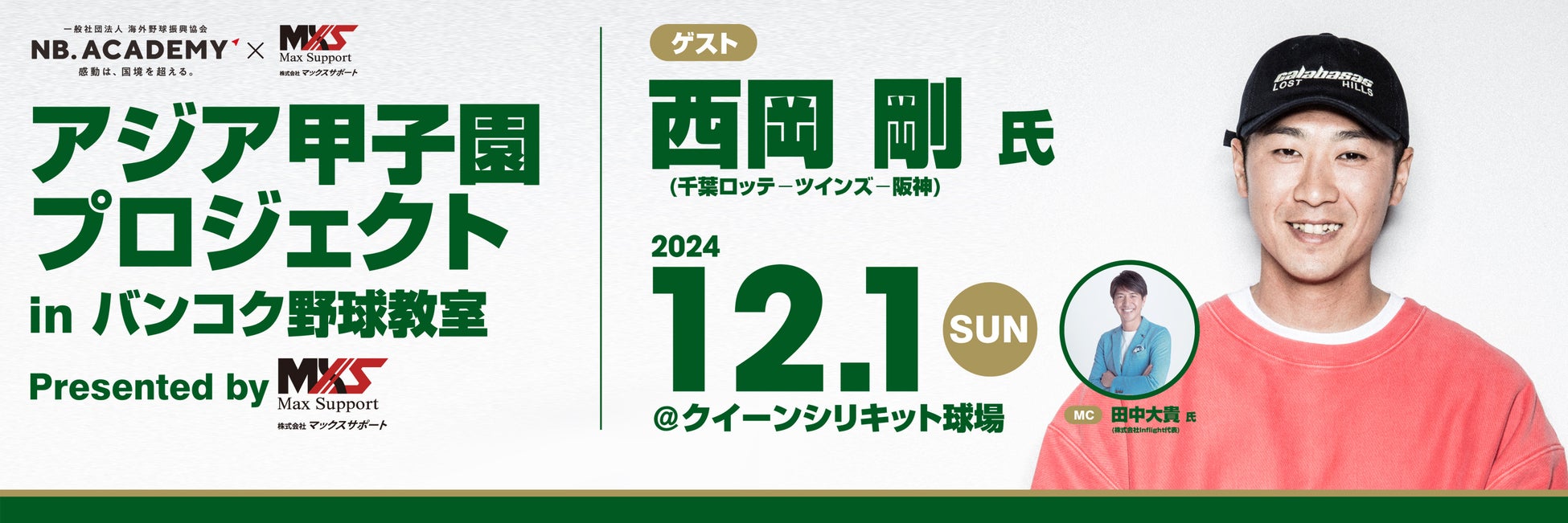 この度、タイ・バンコクにいる子供たちに野球の魅力を伝えられることを楽しみにしています。アジア甲子園大会にも出場可能性のある地で、新たな世代の夢が育つことを期待しています。冠スポンサーとなってくださったマックスサポート様のご協力に感謝いたします。