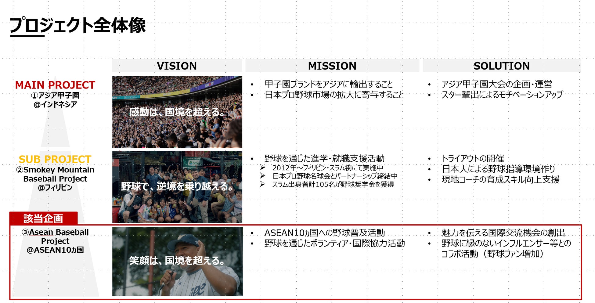 当社は、以下3つのプロジェクトを中心に活動する”海外野球振興協会”です。