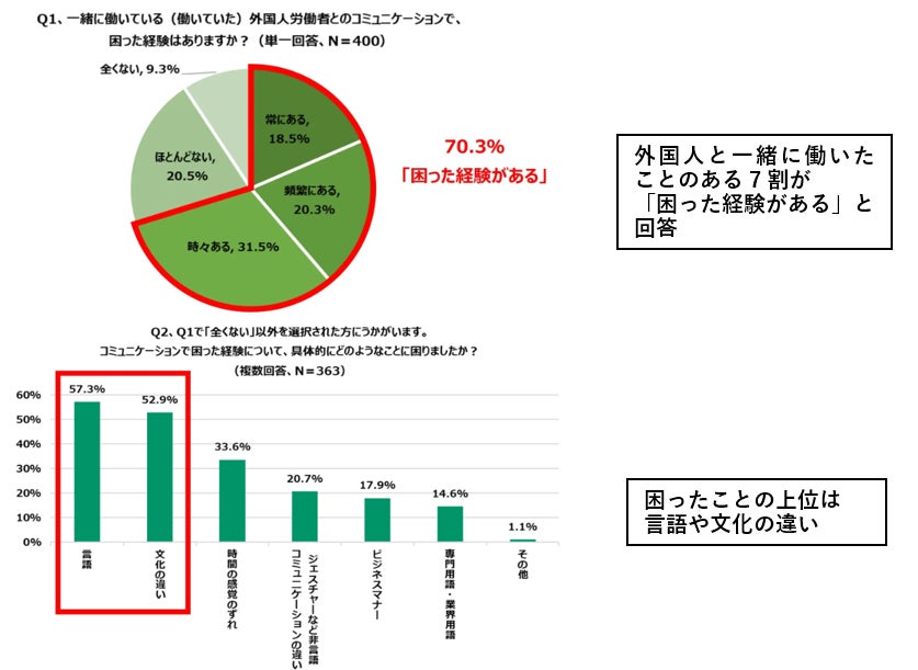 当社が実施した「飲食業界における外国人労働者との関わりに関する実態調査(※1)」においても、回答者の7割以上が「外国人労働者とのコミュニケーションで困った経験がある」と回答し、具体的に困ったことは「言語」や「文化の違い」であることがわかりました。