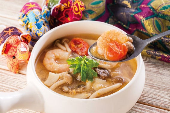 えびや3種のきのこ(ぶなしめじ、エリンギ、マッシュルーム)、チェリートマトが入った酸味のあるスープです。