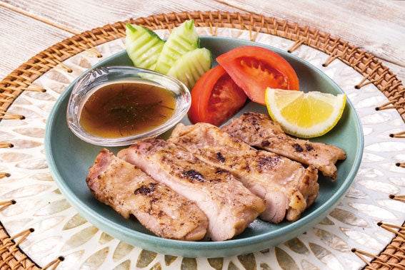 鶏肉をナンプラーやシーズニングソースを使った調味液に漬け込み、炭火でじっくり焼き上げ、食べやすいようにスライスしました。
