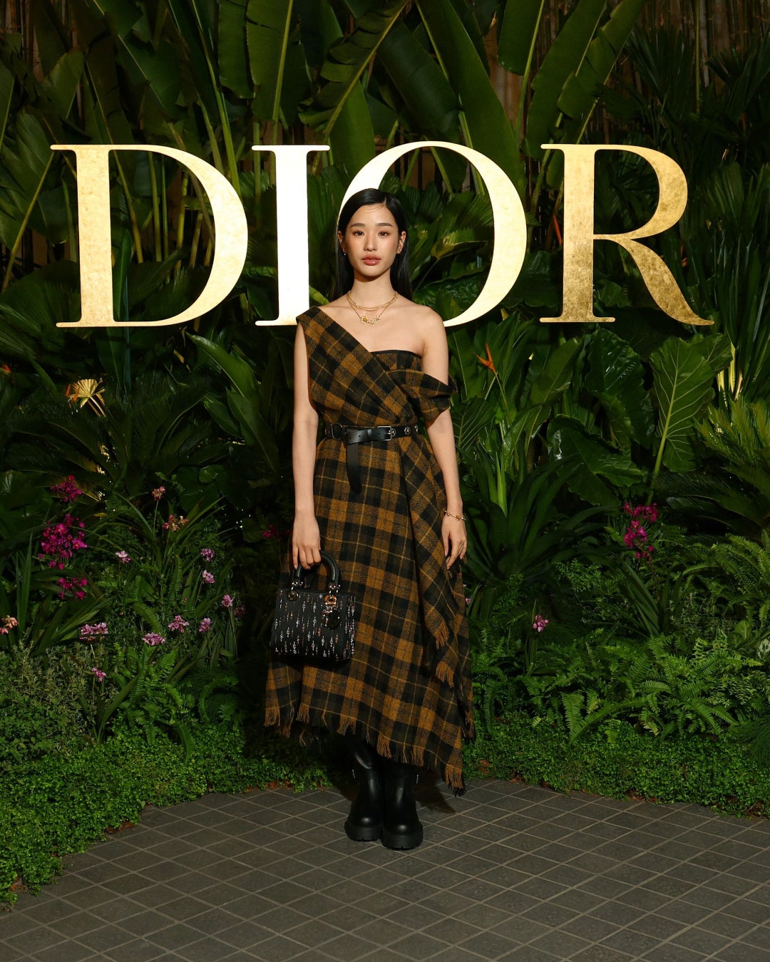 トンタワンは、2025年クルーズ コレクションからイエローとブラックのタータンチェックのウールドレスを纏い、ディオールのバッグ、ベルト、シューズを合わせました。