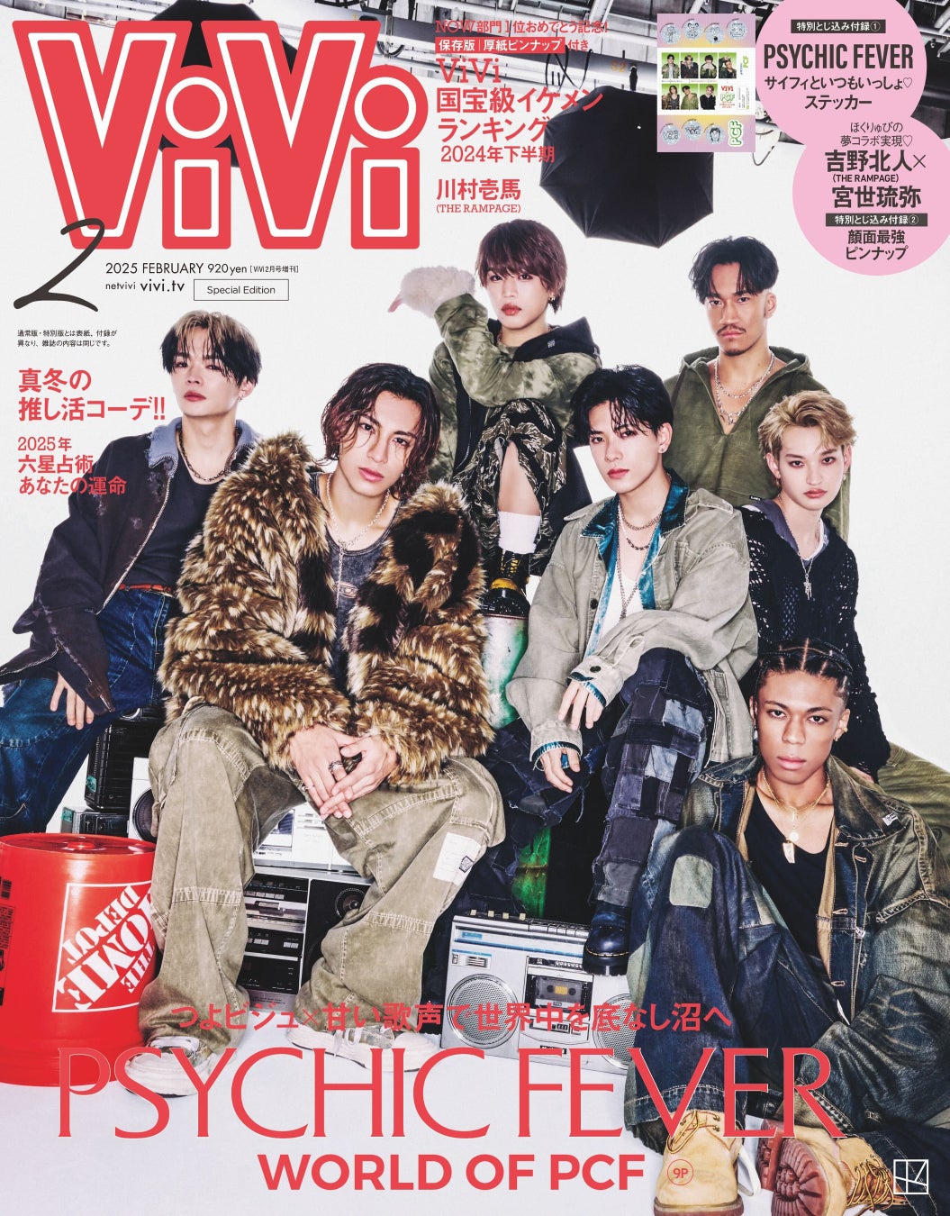 ViVi2月号増刊の表紙を飾るのは、EXILE TRIBE内でも異色の魅力を放つPSYCHIC FEVER。2024年1月にリリースされた楽曲『Just Like Dat feat. JP THE WAVY』が大バズりしたことをきっかけに、彼らが生み出す中毒性のある音楽やパフォーマンスに世界中がトリコに…! 1年を通してフィーバーしたPSYCHIC FEVERのみなさんに、、今年ラストのViViの顔にと出演オファーしました。