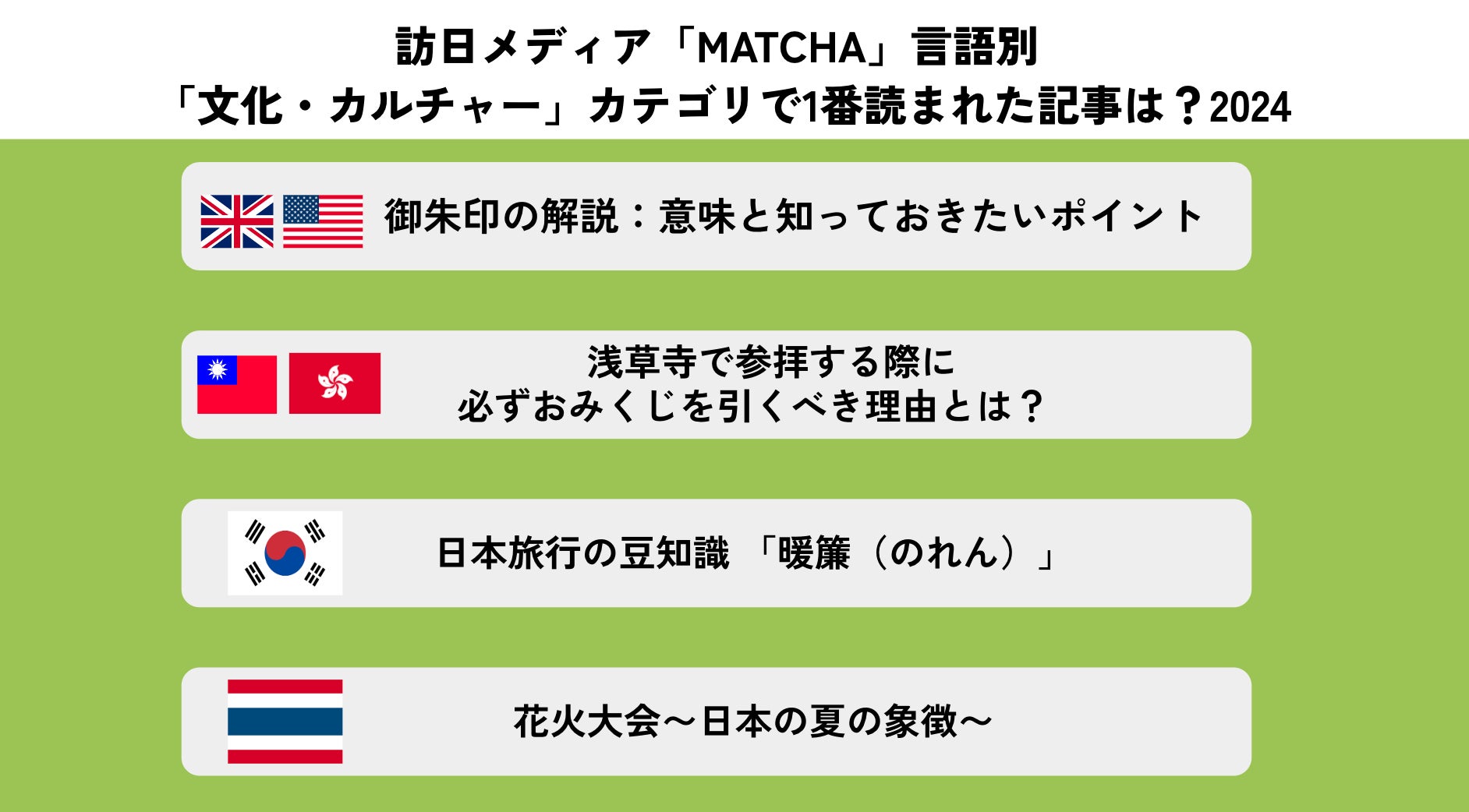 - 各国で異なる「日本文化」への興味が明らかに!2024年訪日メディアMATCHA記事ランキング発表