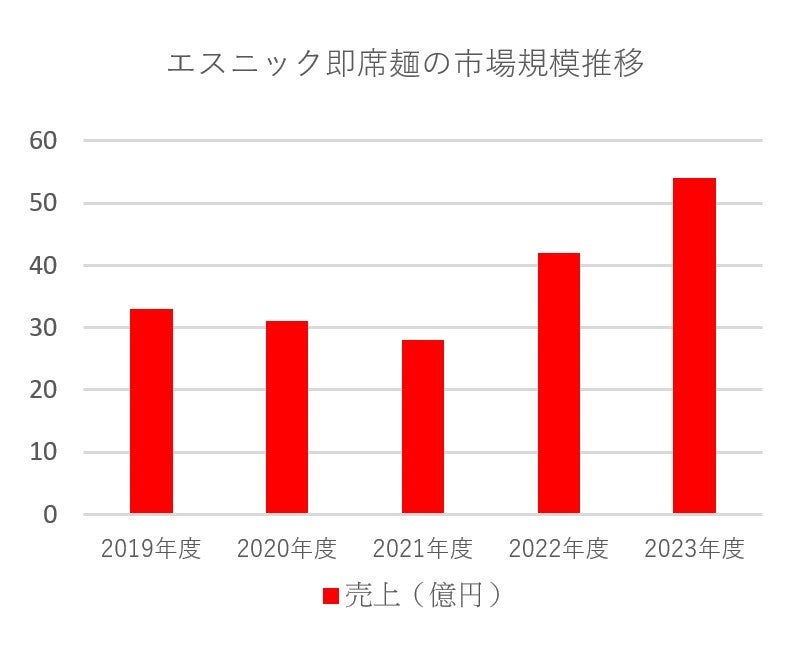近年エスニック料理は日本でも高い人気を集めており、中でも2023年度の国内のエスニック即席麺市場は54億円(2019年度比163%)※1と、今後もさらなる拡大が予想されます。